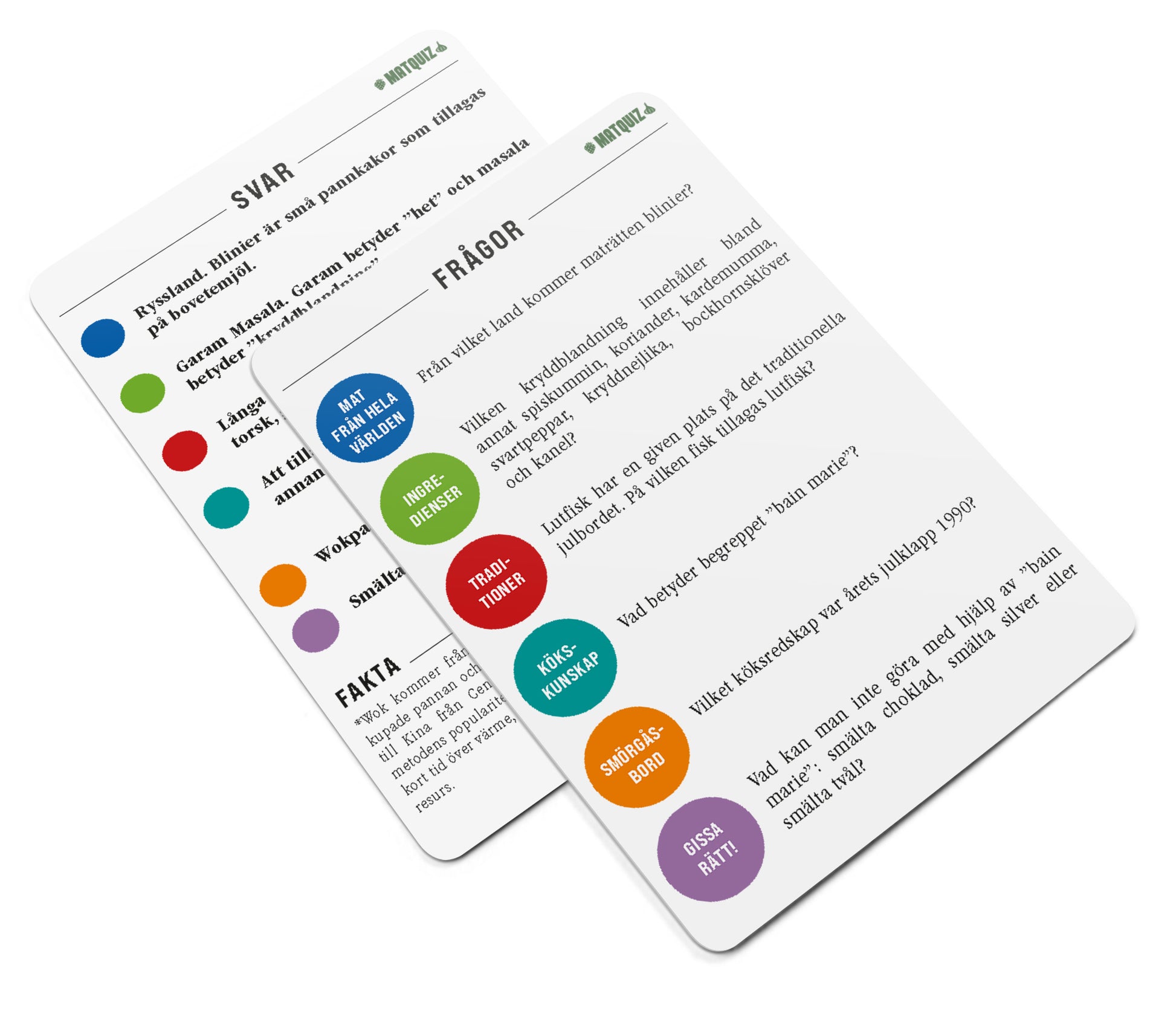 I Matquiz får du svara på kluriga, roliga och ibland oväntade frågor om allt som hör köket till – från världens matkulturer och traditioner till råvaror, teknik och smak. Frågorna är uppdelade i sex kategorier. Med varierande svårighetsgrad passar spelet lika bra för hobbykocken som för mästerkockarna. Fylld med kunskap, skratt och aha-upplevelser – Matquiz är den perfekta ingrediensen för en smakrik spelkväll.